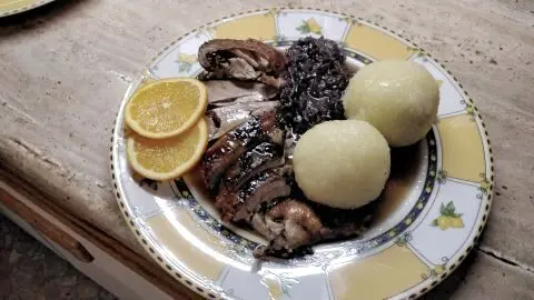 Ich hoffe, dass das jetzt für alle verständlich ist. Vielen Dank. Ente und Knödel sind fertig, das Blaukraut als Beilage habe ich extra bedacht.