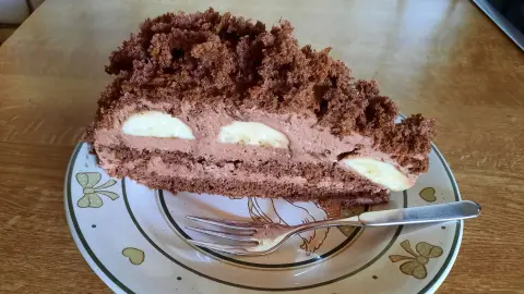 Um einen Maulwurfkuchen mit Bananen zu machen, kaufte ich mal beim Bäcker einen fertigen Tortenboden. Da dieser aber für meinen Zweck zu groß war, habe ich ihn halbiert. Dann wurde ein Schokoladen-Pudding gekocht, der mit Quark, Schmand und Sahne verfeinert und damit auch etwas heller wurde. Danach konnte gleich geschichtet werden mit der leckeren Pudding-Quark-Schmand-Sahne-Creme und natürlich den halbierten Bananen. Ein Boden wurde zerbröselt und als letzte Schicht aufgetragen. Auch habe ich mich bemüht, eine gerundete Tortenform hinzubekommen, die die Form eines Maulwurfhaufens haben sollte. Durch den fertigen Tortenboden ging das Ganze recht fix. Wie ich dabei vorging, beschreibe ich euch gerne: