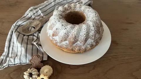- Gib den Teig in die eingefettete Form und backe das Ganze für etwa 50 Minuten. Die Stäbchenprobe verrät dir, ob der Kuchen fertig ist.