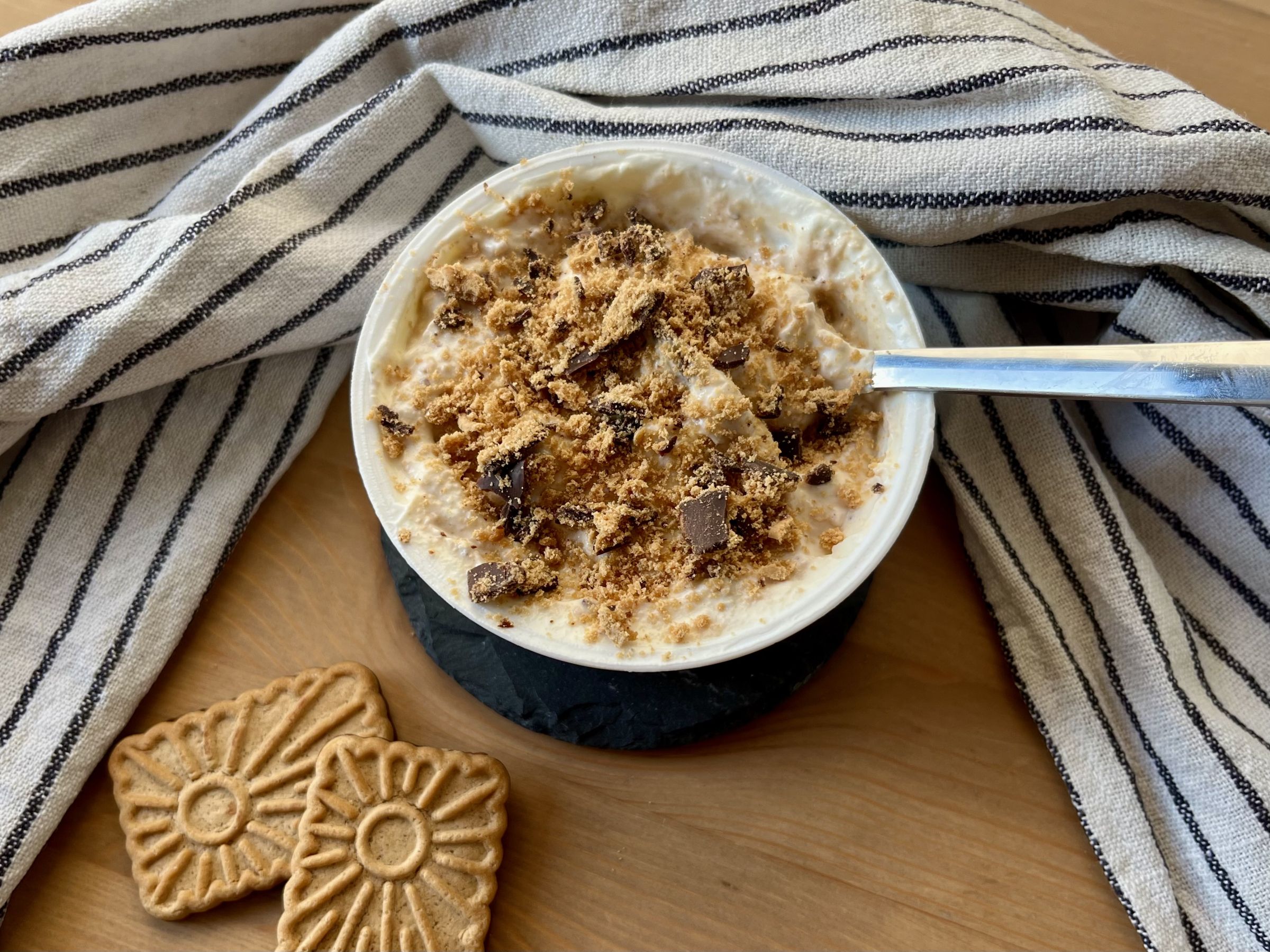 - Brich die Biscoff-Kekse in der Mitte durch und stecke sie vollständig in den Joghurt.