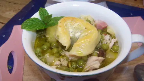 - Die Tortellini sowie die Erbsen in die Brühe geben.