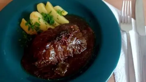 - Pro Person legt man eine Roulade zusammen mit einem Schöpflöffel der Soße auf die Teller.
