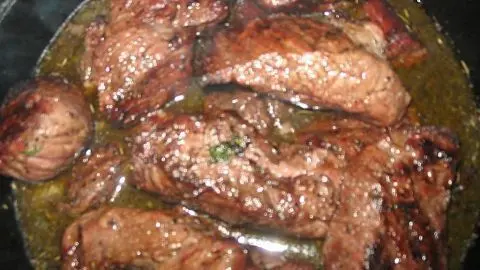 - Am Vortag das Fleisch marinieren: Rindernacken in etwa kinderfaustgroße Stücke schneiden. Aus Öl, Salz, Pfeffer, Piment, Lorbeer, Petersilie und in Scheiben geschnittenen Zwiebeln eine Marinade mischen. Fleisch und Marinade in einen festen Gefrierbeutel geben und 24 Stunden im Kühlschrank ruhen lassen.