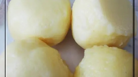 - Aus der Kartoffelmasse Klöße formen und dabei in die Mitte einige von den gerösteten Brötchenwürfeln drücken. Schöne runde Klöße formen, die keine Risse haben dürfen, da sie sonst abkochen. Dazu die Hände öfter mal unter kaltem Wasser anfeuchten.