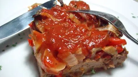 - Zunächst Paprika, dann Champignons und Zwiebel und zum Schluss die Zigeunersoße auf der Hackmasse verteilen.