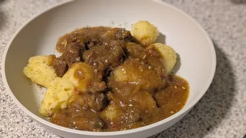 - Einen Teller oder eine Schale nehmen und zuerst die Beilage (bei mir selbstgemachte Knödel) hineingeben. Darüber den Gulasch mit der Soße und anschließend sofort servieren.