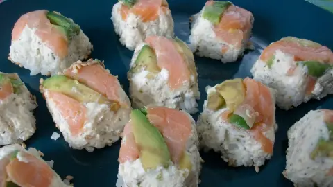 Sushi, anders, einfach … Was verstehe ich darunter? Sushi, welches ganz einfach und schnell auf andere (nicht traditionelle Art) zubereitet wurde. Ich liebe Sushi, aber nur die California Rolls, denn ich mag keine Noriblätter. Mit der Sushitechnik habe ich sicher auch meine Probleme. Da sah ich vor einiger Zeit einen genialen Trick, diesen habe ich nun endlich mal in die Tat umgesetzt.