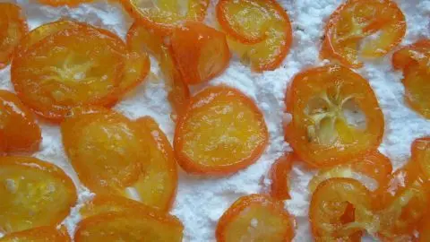 - Die gut abgetropften Kumquat- (Orangen-) scheiben gleichmäßig auf dem Puderzucker verteilen, darauf achten, dass die Scheiben nicht aufeinanderliegen.