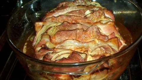 - Nun schindelförmig Fleisch, Schinken, Zwiebeln - Fleisch, Schinken und Zwiebeln auf die Folie schichten.
