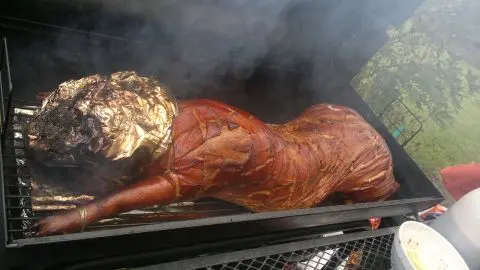 Garzeit: Das Ferkel 8–10 Stunden bei der Low-and-Slow-Methode garen. Die Gartemperatur soll zwischen 90 und 120 °C liegen. Die Kerntemperatur sollte etwa 85 °C betragen.