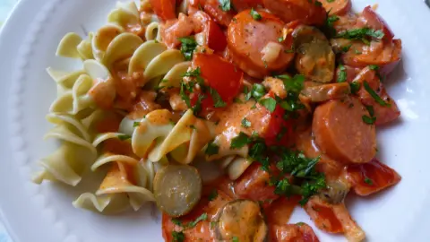 - Wurst, Tomaten, Zwiebeln und Gurken etwa 5 Minuten in Butter anbraten.