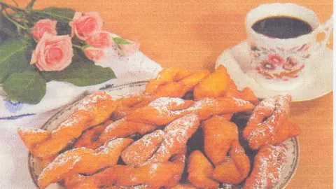 - Die Teigstücke in das heiße Fett geben, goldbraun ausbacken und mit Puderzucker bestäuben.