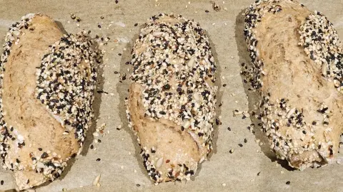 Wer mag, kann für die Kruste optional Leinsamen, Hanfsamen, Sonnenblumenkerne und Sesam zum Wälzen verwenden.