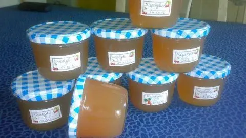 - Die Saftmenge plus Zitronensaft abmessen und dementsprechend der Packungsaufschrift den Zucker zufügen (meistens 750 ml Saft und 500 g Zucker).
