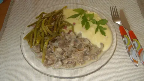 Dazu gibt es bei uns Kartoffelpüree und Bohnengemüse.