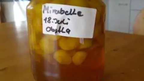 - Mirabellen halbieren, eventuell, wenn sich der Stein nicht lösen lässt, dann drinnen lassen. In ein Gefäß geben, das einen weiten Hals hat. Mit Obstbrandwein auffüllen, Kandis dazugeben sowie die Zimtstange.