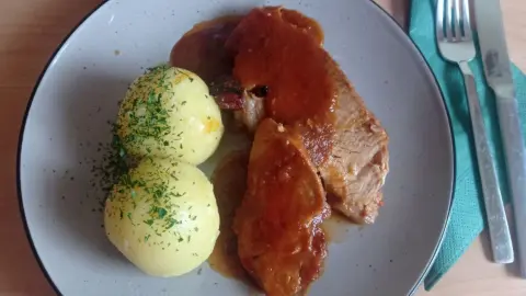 - Auf den Tellern werden nun vom Fleisch jeweils 1 bis 2 Scheiben platziert und die Klöße legt man gleich dazu. Etwas von der Soße gibt man über das Fleisch und die Klöße.