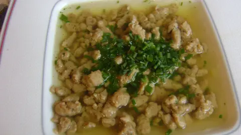 - Den fertigen Leberreis in eine gute Rindsuppe oder Gemüsesuppe oder Hähnchensuppe geben, mit Schnittlauch bestreuen und genießen.