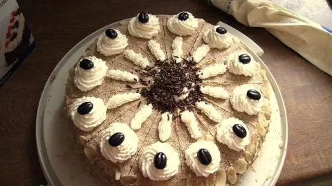- Mit der dritten Biskuitschicht belegen und die restliche Mokkacreme gleichmäßig über die Seiten und die Oberfläche der Torte verstreichen.