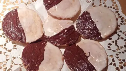 - Der Puderzucker wird mit dem Zitronensaft gemischt und dann mit einem Pinsel auf die ausgekühlten Amerikaner halbseitig aufgetragen. Auf die andere Hälfte wird dann der Schoko-Guss verteilt.