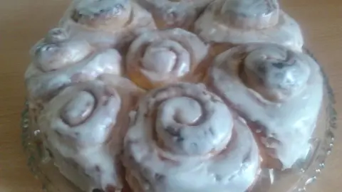 - Von der Längsseite her aufrollen und in 7 - 8 dicke Scheiben schneiden. Eine Springkuchenform (28 cm) ausfetten und die Scheiben hineinsetzen. Abdecken und in Wärme gehen lassen.