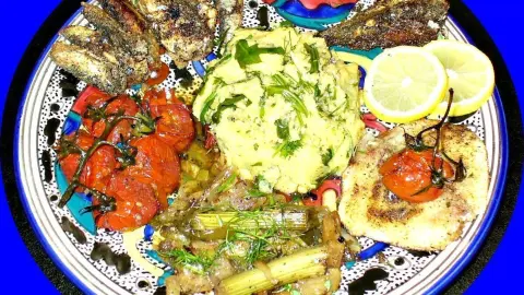 - Zwiebeln, Knoblauch, in feine Streifen geschnittener Fenchel, Petersilie und den Zweig Strauchtomaten mit Salz und Pfeffer würzen, in eine leicht geölte Auflaufform geben und ca. 15-20 Minuten grillen. Evtl. etwas Brühe oder Wein dazugeben.