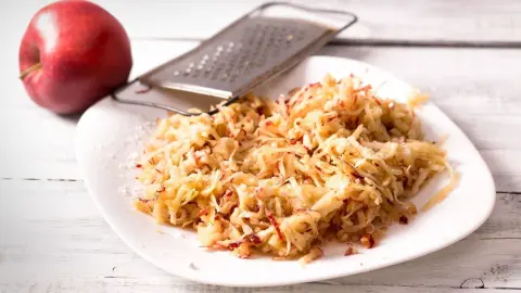 Ich habe die Äpfel fein geraffelt und mit gemahlenem Zimt, Honig und Zitronensaft verfeinern. Ob die Äpfel mit oder ohne Schale geraffelt werden, ist dabei Geschmacksache.