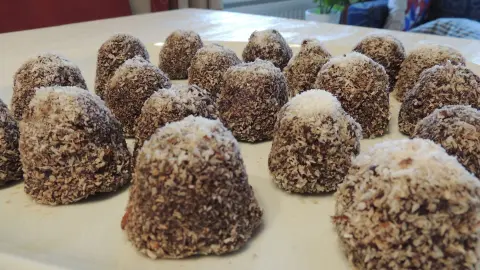 - Ein halben Esslöffel von der Masse mithilfe der Kokosflocken formen. Anders gehts nicht, da diese extrem an den Fingern klebt. Sie sollte gerade mal so fest sein, dass man daraus so kleine Schwedenbomben (in Deutschland Schokoküsse) formen kann.
