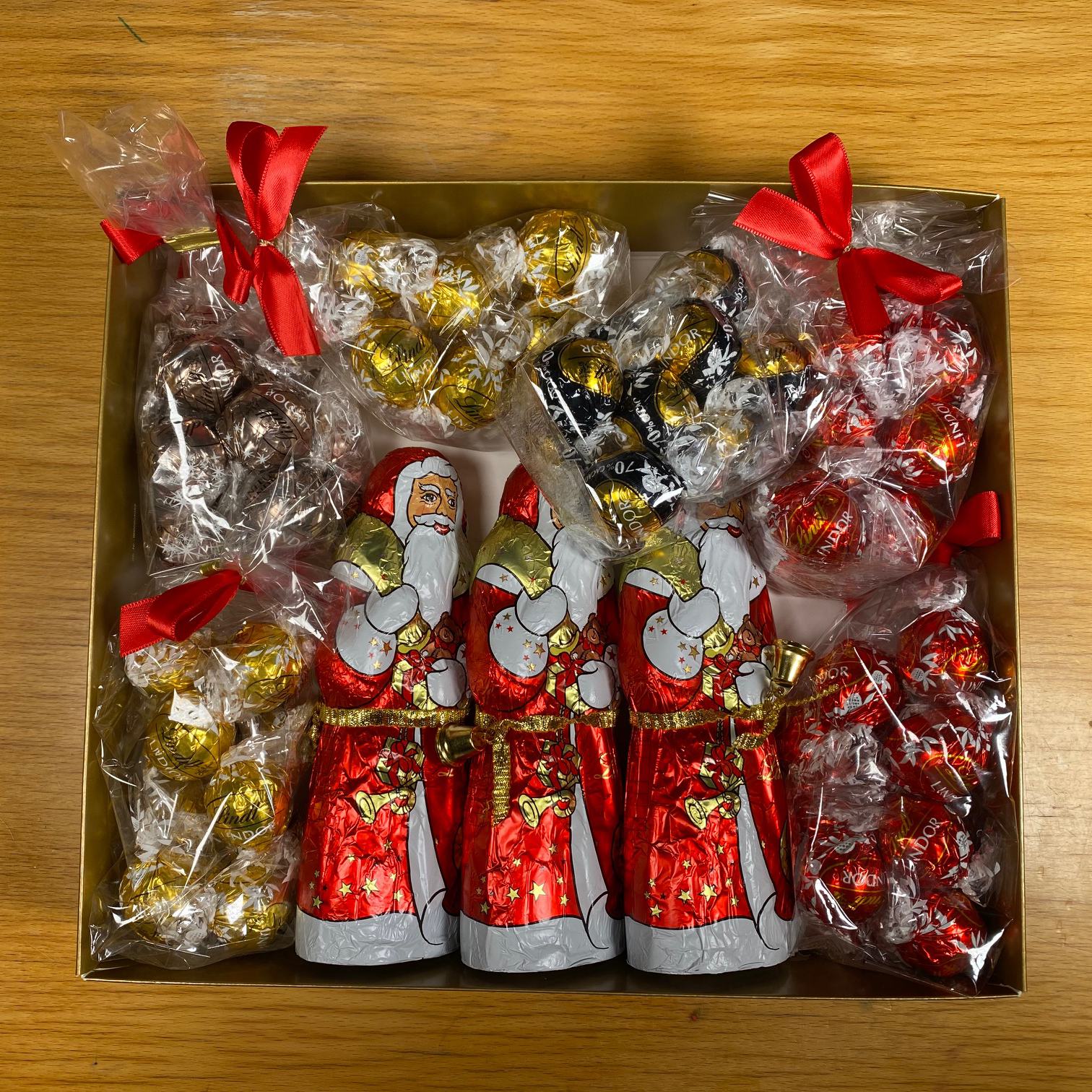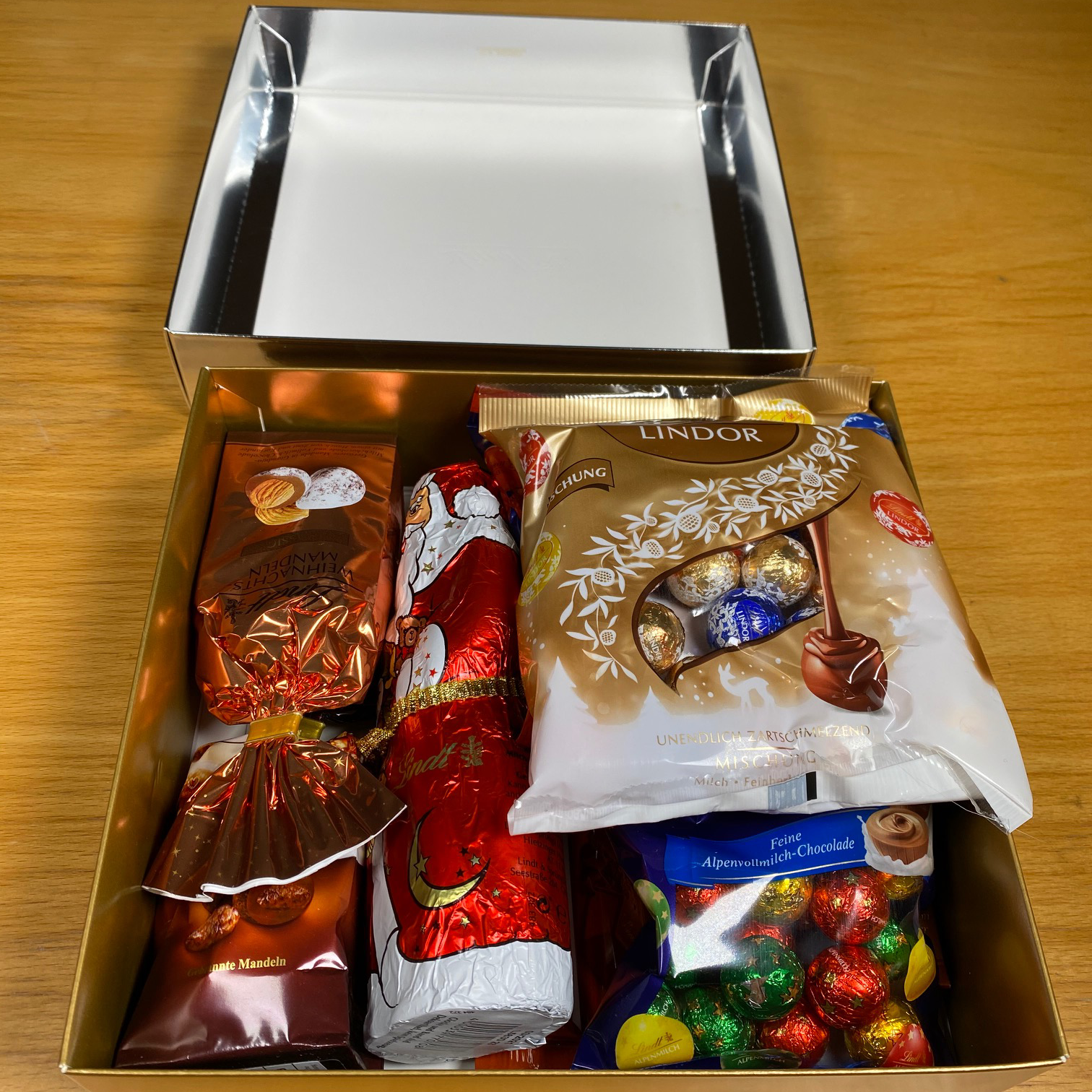 | Inhalt: | 1x Weihnachtsmarkt gebrannte Mandeln 100g, 1x Mini Weihnachtsmann Gold Vollmilch 50g, 1x Mini Engel 50g, 1x Weihnachts-Mandeln 100g, 1x Weihnachts-Chocolade 100g, 1x Lindor Kugeln-Mix 145g, 1x Weihnachtsmann 125g, 1x Cresta-Baumbehang 100g, 1x Alpenmilch-Mini-Kugeln 100g |
