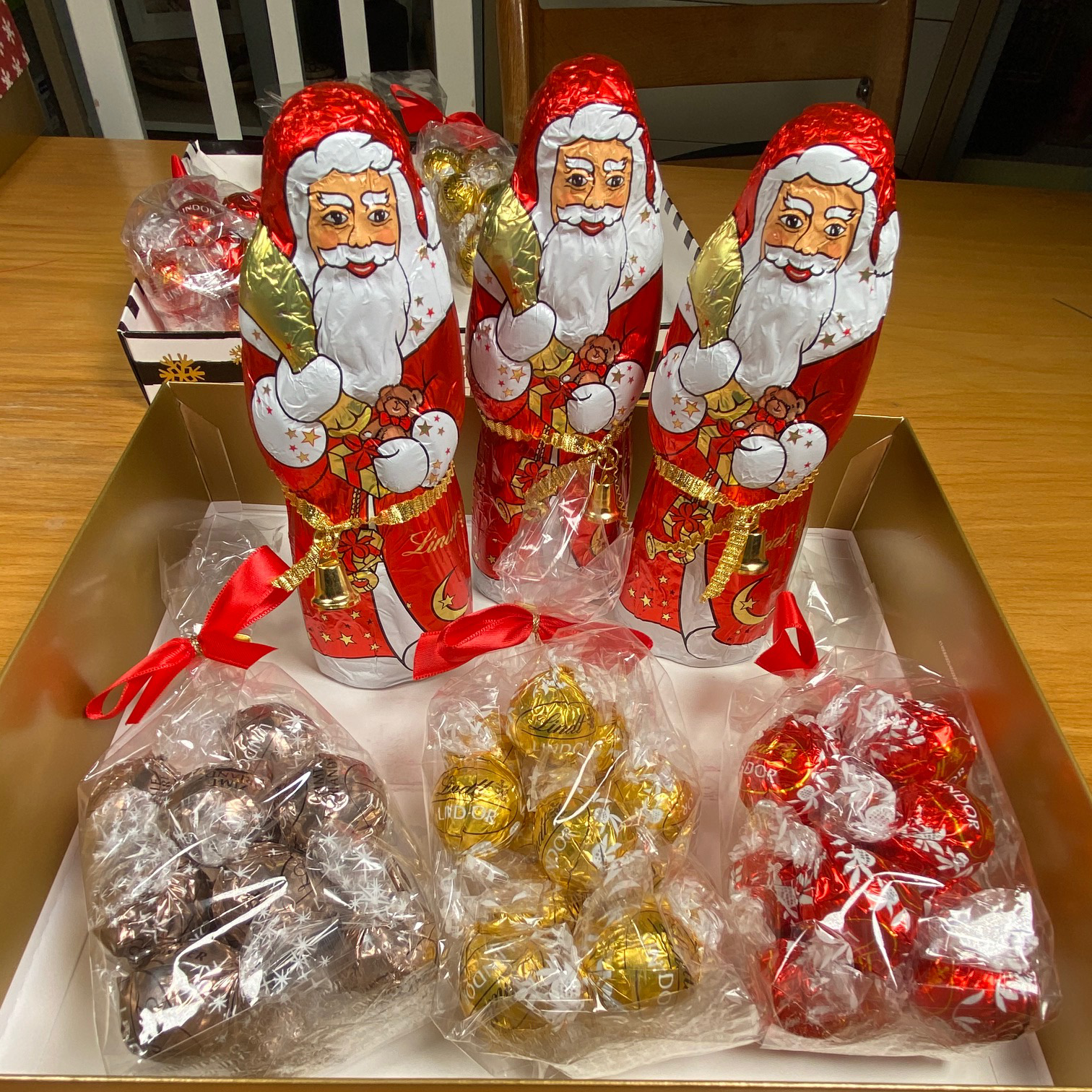 | Inhalt: | 1x Weihnachtsmann Vollmilch 125 g, 2x Weihnachts-Chocolade-Sticks je 39 g, 1x Gebrannte Mandeln 100 g, 1x Weihnachtsmandeln 100 g, 1x Cresta-Baumbehang 100 g, 1x Weihnachts-Chocolade 100g, 1x Lindor Mini-Kugeln-Mix 180 g, 1x Alpenmilch-Mini-Kugeln 100 g |