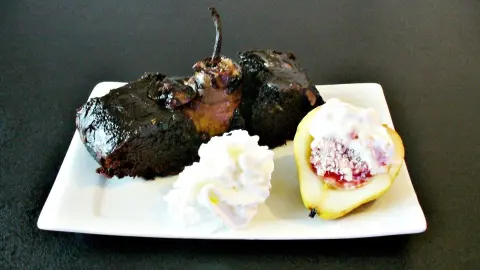 - Die Birnen halbieren, das Kerngehäuse entfernen und mit Mandelblättchen, evtl. Obstlikör oder Rumrosinen füllen, wieder zusammensetzen und nebeneinander in die Form setzen, sodass die Stängel noch sichtbar sind.