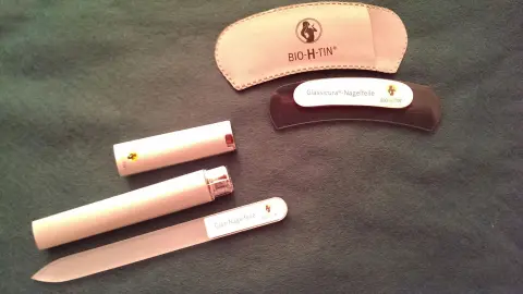 Wo wir doch aktuell bei der Fersenpflege sind, möchte ich hier die Glasnagelfeilen der Firma Bio-H-Tin vorstellen. Die kurze, leicht gebogene Feile ist deshalb sehr gut einsetzbar, weil man mit ihr ganz leicht abgerundete Fingernägel maniküren kann: