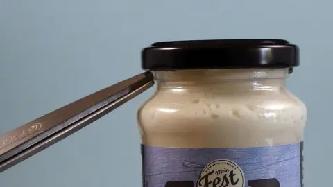 Mit einer Seite gehe ich denn leicht unter den Deckel zwischen Deckel und Glass und drücke die Schere einmal gegen das Glas bis ich ein Zischen höre.