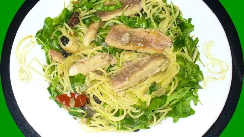 Ein ganz schnelles Gericht, das extrem günstig ist und geschmacklich überzeugt: Spaghetti in Knoblauchsoße mit Sardinen und Rucola.