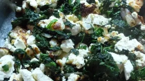 Spinatpfanne mit gebratenem selbstgemachten Käse aus Milch. Frischer Spinat, geputzt und gebrüht, dann gehackt. Mit Zwiebeln, Milchkäse und Knofi gebraten.