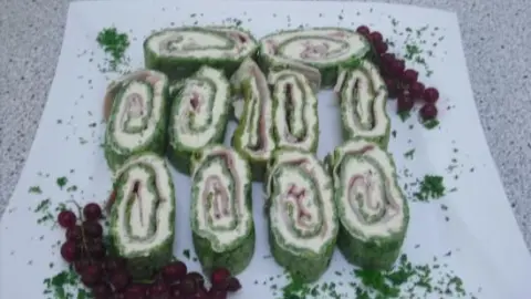 - Darauf ca. 6 Scheiben Kochschinken verteilen und aufrollen. Etwas kühl stellen.
