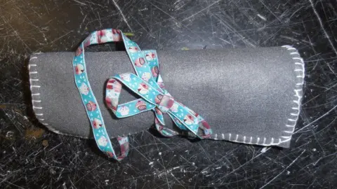 - Stifte/Pinsel in den Fächern verstauen, zusammenrollen und -binden - fertig. Vor der Benutzung nicht vergessen, die Stecknadeln zu entfernen!