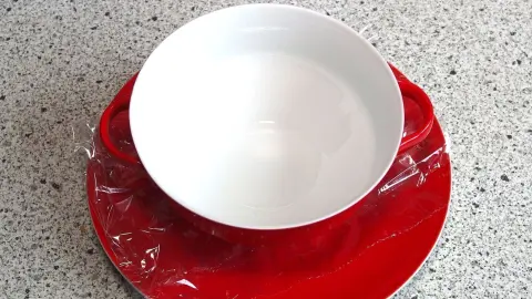 Gefüllte Suppentassen, die auf einem Unterteller serviert werden, rutschen sehr leicht. Man kann Abhilfe schaffen, in dem man etwas Frischhaltefolie locker zusammen drückt, dann auf den Teller legt und die Tasse darauf stellt. So rutscht keine Suppentasse mehr.