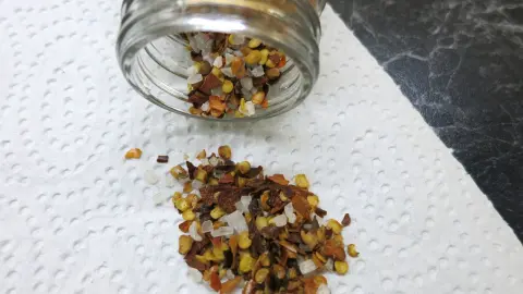Fertig ist ein Chili-Salz, das jedem pikanten Essen einen richtigen Pep verleiht. Trocken aufbewahrt hät dieser Vorrat Jahre.