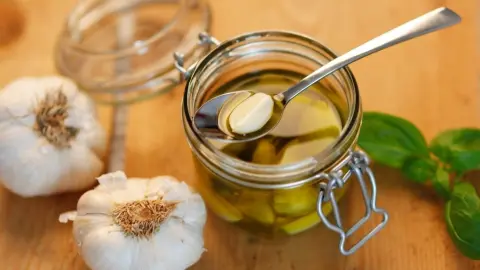 Knoblauch hält sich länger frisch, wenn man die Zehen schält, in ein Schraubglas gibt und mit Öl bedeckt. So kann man die Zehen nach und nach verbrauchen und das aromatisierte Öl für Salate verwenden.
