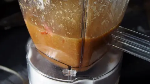 Ich habe eine Portion gemischten Salat (ohne Kart. Salat!) zusammen mit genügend Dressing einfach in einen Mixer gegeben und gut durchgemixt. Anschließend das Ganze in ein Trinkglas- und servieren.