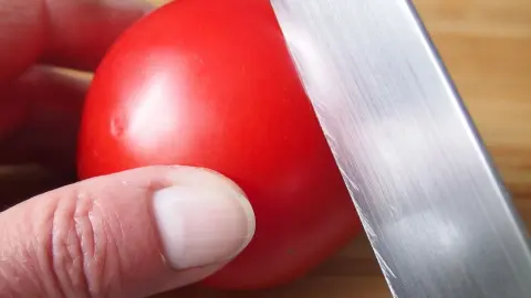 Man schabt mit der Messerschneide kräftig über die Haut, ohne sie dabei zu einzuschneiden. Die Tomaten lässt man ein paar Minuten ruhen. Dann die Schale rundherum einschneiden, abziehen, fertig! Je reifer die Tomaten sind, desto besser klappt es.