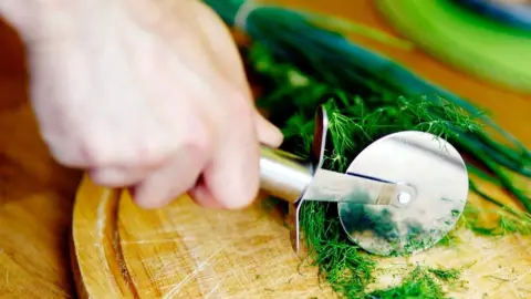 Der Pizzaschneider, dieses runde Messer, muss sich nicht in der pizzafreien Zeit ausruhen.