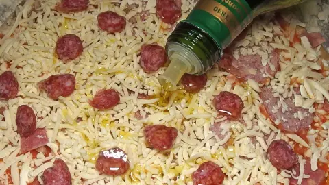 Einfach das Ölivenöl in kreisenden Bewegungen über die Pizza rüber, so ca. ein Teelöffel.