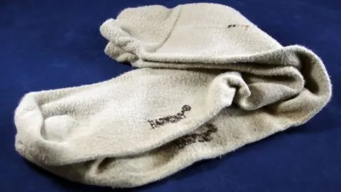 Beige Herrensocken liegen zerknittert auf einem blauen Hintergrund, was auf möglichen Verschleiß hinweist.