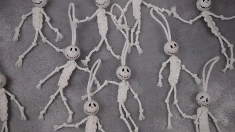 Ich konnte gar nicht damit aufhören, die lustigen Kerlchen zu basteln – so viel Spaß hatte ich beim Knüpfen. Am Ende hatte ich so viele Skelette, dass ich daraus eine Girlande gemacht habe.