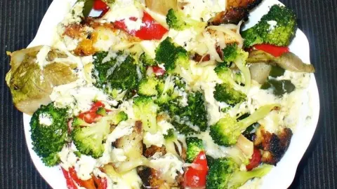 Ich habe das Gemüse am Rand entlang in einer backofenfesten Form aufgestellt, abwechselnd Brokkoli, Fisch, Paprika, Chicoree. Danach mit etwas Salz und Pfeffer würzen, einige Kleckse Kräuterfrischkäse dazugeben und Käse darüber hobeln oder mit Pizzakäse belegen.
