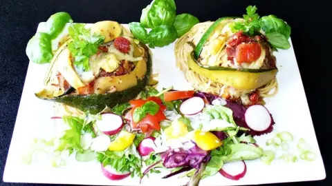 In dieser Jahreszeit suche ich stets nach neuen Rezepten, um die vielen Zucchini in meinem Garten schmackhaft zu verwerten. Heraus kam eine leichte schnelle Mahlzeit, für die folgende Zutaten benötigt werden.