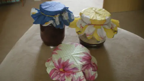 Ich falte diese geschnittenen Teile nun auseinander und lege sie auf den Deckel der Gläser und fixiere sie mit einem Gummi. Anschließend richte ich die Bögen so aus, dass es schön aussieht. Nun brauchen sie nur noch verschenkt werden.