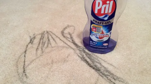 Mit Lappen, heißem Wasser und Spülmittel bin ich den Strichen auf dem Teppich zu Leibe gerückt. Es hat zwar ein paar Minuten und einige Tropfen Spülmittel benötigt, aber der Fleck ging raus. Natürlich habe ich zu viel Spülmittel verwendet, so dass ich hinterher noch eine Weile damit beschäftigt war, das Spülmittel mit Wasser und Lappen aus dem Teppich zu waschen.